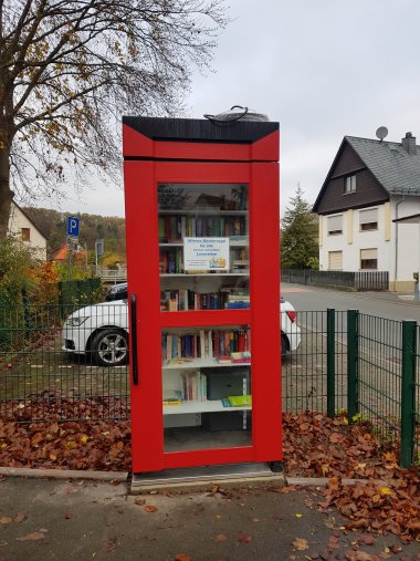 Die Beschaffung der Telefonzelle hat sich eine Weile hingezogen, erst ein Jahr nach der Bestellung wurde diese von der Telekom ausgeliefert, in magenta-grau und ohne Inhalt. Die Kosten für die Zelle beliefen sich auf 1.000 Euro, dazu kamen noch Lieferkosten von knapp 500 Euro. Die Mitarbeiter des Bauhofs haben für die Büchertelefonzelle ein Fundament gegossen, sie mit roter Farbe verschönert, eine Lampe und eine Regalrückwand eingebaut. In den nächsten Tagen soll der Stromanschluss an die benachbarte Straßenlaterne erfolgen.