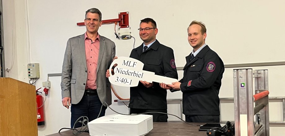 Kürzlich fand die offizielle Schlüsselübergabe für das neue MLF (Mittleres Löschfahrzeug) der Feuerwehr Niederbiel statt. Wehrführer Sarturnin Grzelinski und sein Stellvertreter Henrick Neumann präsentieren neben Bürgermeister Inderthal den symbolischen Schlüssel für das Foto.