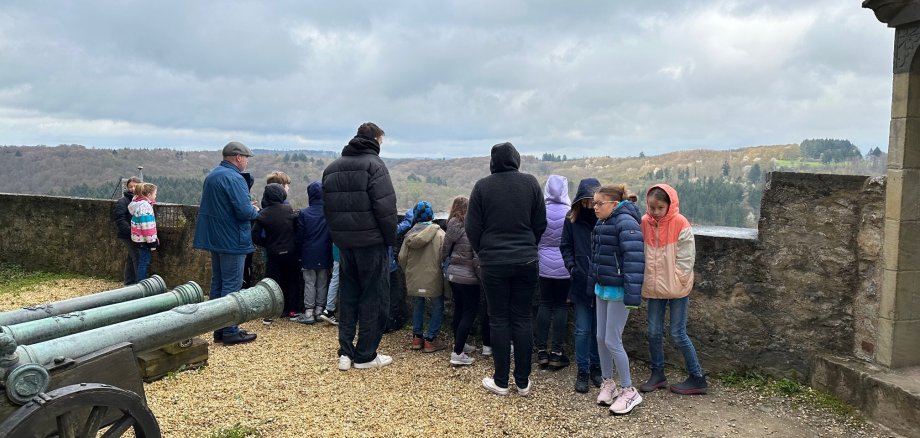 Die Führung begann im Schlosshof, wo sie erfuhren, dass der Graf von Solms noch in dem Schloss wohnt. Auf dem Boden konnten die Kinder das Braunfelser Wappen deutlich erkennen. Anschließend ging es in den Rittersaal. Hier wartete eine Aufgabe auf die Kinder. Sie bekamem Ausschnitte von Fotos in die Hand. Die Gegenstände, die darauf zu erahnen waren, sollten sie in dem Rittersaal finden. Die Kinder konnten aber nicht nur das Schloss bestaunen, sondern auch die Kanonen. „Wie denkt ihr denn eigentlich, wie die Kanonen damals funktioniert haben?“, fragte der Schlossführer.