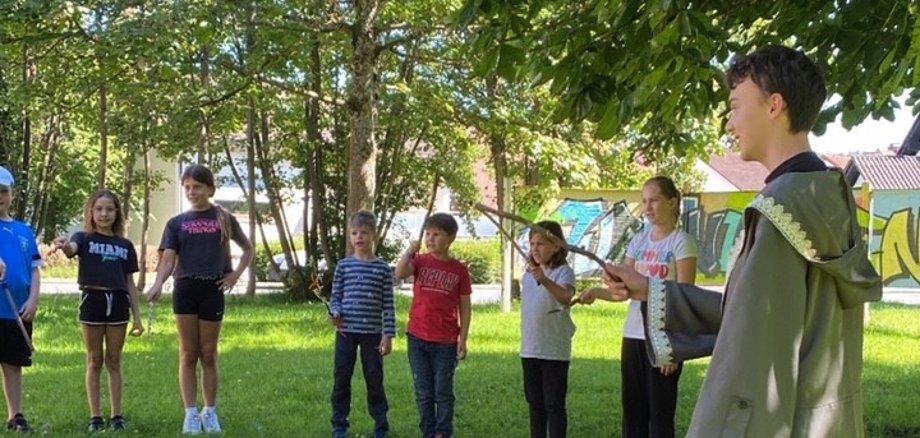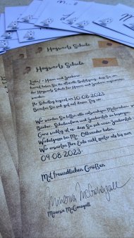 Bei Mr. Ollivander in der Winkelgasse. Also machten sich alle auf den Weg nach draußen und gestalteten Stöcke mit Draht, Wolle und Kreppband. Ganz schnell wurden daraus schließlich echte Zauberstäbe. Im Anschluss machten sich alle auf den Weg nach Hogwarts. Dafür mussten sie auf Gleis 9 ¾ und mit dem Hogwartsexpress Richtung Zauberschule fahren. Dafür teilten sich die Kinder in zwei Gruppen, die in zwei Stuhlreihen hintereinander saßen. Im letzten Abteil wurde in mehrere Runden jeweils ein Zaubergegenstand hochgehalten, welches nonverbal von Reihe zu Reihe bis ins erste Abteil übermittelt werden musste. Zur Belohnung, dass es beide Züge bis nach Hogwarts geschafft haben, gab es schokoladige Zauberfrösche. In Hogwarts angekommen, mussten sie sich dem sprechenden Hut stellen. Der verriet allen in welchen Teams sie die nächsten Herausforderungen meistern mussten. Bevor jedoch das Schuljahr begann, gab es noch ein großes Festessen. Die erste Unterrichtseinheit beschäftigte sich mit dem Zaubern. Die Kinder lernten zwei Zaubersprüche mit ihren neuen Zauberstäben. Zur Prüfung gab es zwei Experimente, die mit Hilfe der Zaubersprüche erst richtig wirkten. Für die Stärkung zwischendurch konnten die Kinder ihr Wasser mit Zaubertränken, die aus verschiedenen Sirupen bestanden, verfeinern. Das letzte Unterrichtsfach war „Quidditch“. Dabei handelt es sich um die bekannteste Sportart in der Zauberwelt. Hier traten die Gruppen gegeneinander an, indem sie Bälle in Becher werfen mussten. „Ihr habt nun alle Aufgaben gemeistert und euer erstes Schuljahr in Hogwarts erfolgreich absolviert“, freut sich Nadine Eckert.