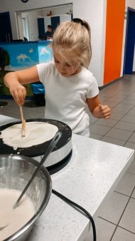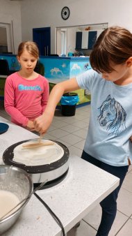„Das ist auch gar nicht so schwer. Wir nehmen eine Kelle Teig und lassen den Teig auf das Eisen laufen. Im Anschluss nehmt ihr den angefeuchteten Teigverteiler und zieht vorsichtig kreise, damit sich der Teig auch gleichmäßig verteilt. Wenn die eine Seite etwas vorgebräunt ist, nehmt ihr den Teigwender und dreht den Crepes einmal um“, erklärt Nadine Eckert. Zu den selbstgemachten Crepes kam schließlich noch eine frische Kugel Eis. Um dem Crepes den letzten Schliff zu verleihen, konnte er noch mit vielen Leckereien verziert werden. Dazu zählten, Zuckerperlen, Früchte, Nutella und Kekskrümel. Eishungrig ging an diesem Nachmittag kein Kind nach Hause.