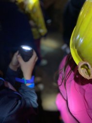 Mittels etwas Wissen zur Gesteinskunde, fällt es den Teilnehmer*innen nun leichter, die Gesteine zu erkennen. Um den Roteisenstein, oder vielmehr das darin enthaltende Eisenerz, drehte sich bis zur Stilllegung des Bergwerks alles. Die Entstehung des Fortuna-Erzes ist schon lange her, was anhand einer Kette veranschaulicht wurde. Die vielen neugierigen Fragen der Kinder bewiesen großes Interesse an den Themen.