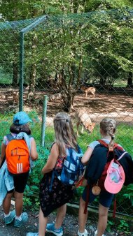 Aber hier war lange noch nicht Schluss. Weiter ging es zu dem Wolfsrudel. Dieses besteht meistens aus einem Elternpaar und deren Kindern, also einer Familie. Wölfe sind Fleischfresser und wurden an diesem Morgen mit Innereien vom Rind gefüttert. Bevor die Wildschweine mit allerhand Gebäck gefuttert wurden, besuchten die Kinder noch die Luchse. Diese sehen aus, wie große Katzen. Unterscheiden sich aber dennoch durch einige optische Merkmale. Sie haben beispielsweise Pinselohren und einen kürzeren Schwanz. Besonders schön sind die verschiedenen Muster des Fells. Nach der Fütterung wurden bei einer gemeinsamen Pause die Eindrücke vom Morgen besprochen. Aber die Kinder hatten noch nicht genug. Selbstständig ging die Gruppe noch weiter und entdeckte noch weitere heimische Tiere. Der Besuch im Streichelzoo war dabei ein echtes Highlight. Nach einem erlebnisreichen Tag und einigen Kilometern Fußmarsch verabschiedeten sich die Kinder fröhlich und erschöpft vom Ferienprogramm.