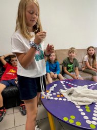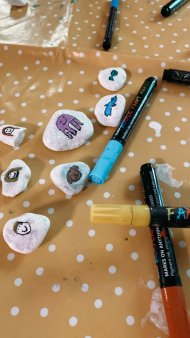 Zu Beginn wurden die Kinder in verschiedene Gruppen eingeteilt. Dabei haben die Kinder selbstständig entschieden, was in den jeweiligen Gruppen gemalt werden soll. Damit aus einzelnen Bildern eine ganze Geschichte entstehen kann, sollten viele verschiedene Dinge gemalt werden. Von dem Lieblingsessen über Naturelemente, Tiere und Menschen war alles dabei. Bemalt wurden dabei große und kleine weiße Steine. Die Kinder konnten hier ihrer Kreativität freien Lauf lassen. Im Anschluss wurden alle Steine in ein Säckchen gelegt und die Kinder verteilten sich auf den Sofas im Jugendzentrum. Nacheinander zog nun jedes Kind jeweils einen Stein und erzählte etwas über den gezogenen Stein. Indem immer wieder ein neuer Stein gezogen wurde, entstand allmählich eine ganze Geschichte. Das machte den Kindern so viel Spaß, dass sie gleich mehrere Runden spielten und dabei ganz viele verschiedene Geschichten erzählten.