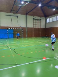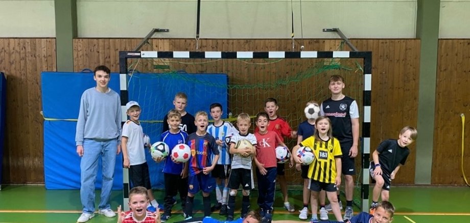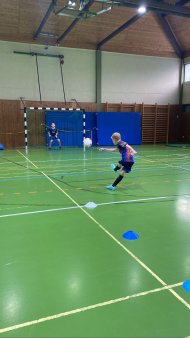 Nach einer kurzen Kennenlernrunde wurde sich zunächst erstmal warm gemacht. „Viele mögen das Aufwärmen nicht, aber es ist so wichtig, um Verletzungen vorzubeugen“, erklärt Felix Boettcher. Im Anschluss wurden Matten in der Halle verteilt und die Kinder in zwei Gruppen aufgeteilt. Fußball-Brennball wurde gespielt. Dabei muss die eine Mannschaft nacheinander den Fußball soweit es geht in die Halle schießen und versuchen schnellstmöglich auf die nächste Matte zu gelangen, während die andere Mannschaft versucht den Ball zu fangen und in ein vorgegebenes Tor zu schießen. Acht Minuten hatte jede Gruppe Zeit das Spiel für das eigene Team zu entscheiden. Am Ende gewann Gruppe zwei haarscharf mit vier Punkten unterschied. Nach einer Trinkpause wurde ein Slalom Parcours aufgebaut, der zum Tor führte. Unter den Teilnehmenden fanden sich auch zwei Torhüter, die es den anderen nicht leicht machten überhaupt ein Tor zu erzielen. Hier war echtes Geschick gefragt. Zum Abschluss der Veranstaltung spielten zwei Teams in einem Mini-Spiel gegeneinander, welches in einem echten Elfmeter-Krimi endete. Erst mit dem letzten Schützen wurde die Partie entschieden. „Mir hat das heute so viel Spaß gemacht!“, so verabschiedeten sich die Kinder in das Wochenende.