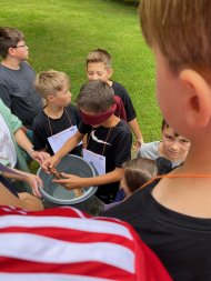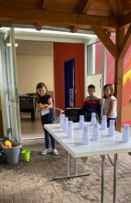 Die Wasserolympiade begann damit, dass die Kinder mit verbundenen Augen vier Gegenstände in einem Wasserbad ertasten mussten. Im Weiteren mussten alle Olympioniken mit Hilfe einer Wasserpistole so viele Becher wie möglich von einem Tisch schießen & eine Seerose aus Pappe bemalen und falten, um sie anschließend in Wasser zu legen und aufblühen zu lassen. Bei der letzten Station ging es besonders um Geschick. Es mussten ein Schwamm, ein Tischtennis- und ein schwerer Ball in Wasserschüsseln geworfen werden. Umso weiter der Wurf war, umso mehr Punkte konnten erzielt werden. Zum Ende der Veranstaltung bekam jedes Kind eine Urkunde und ein Eis. „Nach den vielen Anstrengungen heute, habt ihr euch eine Erfrischung wirklich verdient!“, meint Nadine Eckert abschließend.