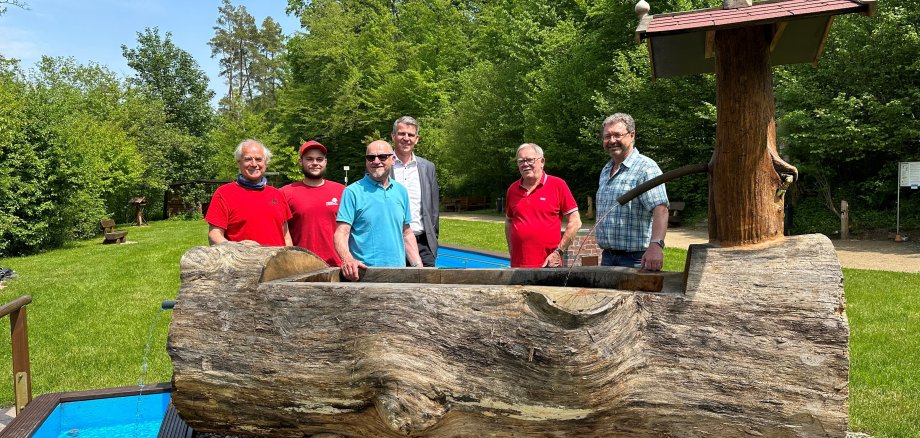 Wer schon einmal an der Kneippanlage Tretbecken im Burgsolmser Mainbachwald war, weiß wie wunderschön die Anlage ist. Bei schönem Wetter ist sie auch sehr gut besucht und es können schon mal 200 Besucher an einem Wochenende werden. Die Kneippanlage Tretbecken wird von den ehrenamtlichen Helfern und Mitgliedern der Interessensgemeinschaft unermüdlich gepflegt, verschönert und erweitert. Einen besonderen Beitrag leistet hierzu Hans-Jürgen Lindenthal, ehemaliger Solmser Forstwirtschaftsmeister, der schon seit einigen Jahren das Mobiliar für die Anlage schreinert. Diesmal hat er zusammen mit seinem Sohn Michel Förster einen Brunnen mit einer besonderen Geschichte gebaut. Das Holz für den Brunnen stammt von einer rund 200 Jahre alten Eiche, die bis vor kurzem noch im Oberndorfer Wald stand. Leider war der Baum extrem trocken und die Rinde hatte sich bereits gelöst, was normalerweise als eine Art Naturdenkmal gelassen würde, aber in diesem Fall musste er leider aus sicherheitstechnischen Gründen gefällt werden. Der Wasserlauf des Brunnens, der aus einem Eisenrohr besteht ist ebenfalls etwas Besonderes, denn das Rohr wurde in einer Astgabel im Wald von jemandem liegen gelassen und das Holz ist einfach um das Rohr herum gewachsen. Neben dem Brunnen hat Lindenthal außerdem noch zwei Sitzgarnituren gefertigt, die das Mobiliar rund um das Tretbecken erweitern.