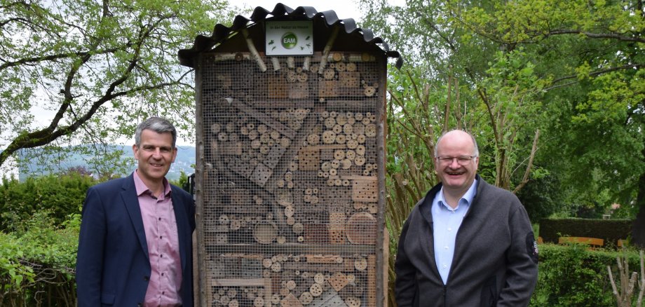 Mit den ersten Sonnenstrahlen im Frühling beginnt auch die Insektenzeit. Wenn es draußen wieder wärmer und sonniger wird, hören wir überall das Summen und Brummen von Bienen, Hummeln und nützlichen Insekten sowie Käfern. Der EAM liegen Naturschutz und Nachhaltigkeit am Herzen. Aus diesem Grund fördert der kommunale Energieversorger die Anschaffung und Aufstellung von XXL-Insektenhotels in den Kommunen ihres Netzgebietes. Darunter ist auch die Stadt Solms: Am Dienstag, dem 9. Mai übergab der Leiter der Netzregion Wetzlar, Burkhard Meth ein großes Insektenhotel an Bürgermeister Frank Inderthal. Das Hotel soll zukünftig ein neues Zuhause für heimische Insekten bieten. Die Insektenunterkunft befindet sich im Stadtteil Albshausen bei der evangelischen Kirche.