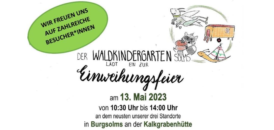 Solms hat mit drei Waldgruppen an drei Standorten eine neue Waldkita gegründet. Dieser Anlass soll gebührend gefeiert werden. Es warten tolle Aktionen auf große und kleine Gäste. Außerdem versorgt das Waldhofslädchen und die Getränke Oase Reuss mit Essen und Trinken. Wir bitten Sie zu Fuß oder mit dem Rad zu kommen, da die Parkplatzmöglichkeiten stark begrenzt sind. Wenn notwendig, sind die Parkplätze an der Kindertagesstätte Burgsolms oder gegenüber der Kindertagesstätte zu verwenden. Bitte StVO einhalten und Rücksicht auf Anwohner und Anwohnerinnen nehmen!