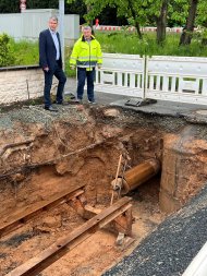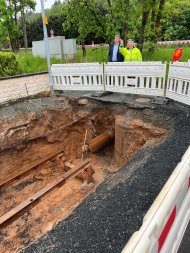 Letzte Woche wurden die Rohre für die Trinkwasserleitung zwischen den Albshäuser Straßen „Vorm Backtor“ und „Am Reiherwald“ unterhalb der Landesstraße mit einem besonderen Verfahren verlegt, um den Straßenverkehr an der betroffenen Stelle so wenig wie möglich einzuschränken. Gemäß einer Auflage von Hessen Mobil wurde die Wasserleitung nämlich in den Boden gepresst, so dass eine Öffnung in diesem Bereich der Straße nicht notwendig war. Mit einer hydraulisch angetriebenen Bohrpressanlage wurden zwei Rohrteile von insgesamt 24 Metern unterirdisch in die Erde gedrückt. Die Erde wurde dabei mittels einer Förderschnecke nach außen transportiert. Diese Art Arbeiten können nur von Spezialfirmen durchgeführt werden, in diesem Fall die Firma Spiekermann Bohrtechnik aus Schmallenberg im Hochsauerland. Die Pressung verzögerte sich zwar wetterbedingt etwas, verlief aber ansonsten problemlos, da der Lehm-Sand-Boden keine Probleme bereitete. Schlussendlich werden nun die Trinkwasserleitungen durch diese eingepressten Rohre geführt. Bei komplikationslosem Ablauf sollte die Baustelle mit Lichtanlage an der Landesstraße pünktlich vor dem kommenden Feiertag abgebaut werden. Lediglich die Anwohner der genannten Straßen müssen noch mit Einschränkungen rechnen, da dort die neue Leitung an das bestehende Wassernetz angeschlossen wird.