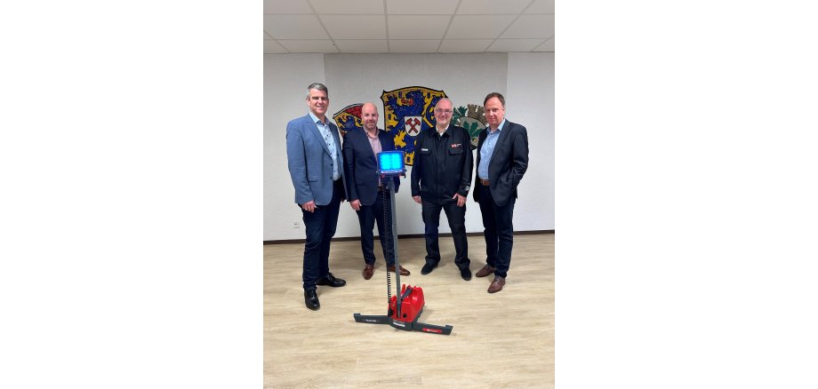 Herr Michael Schmitt und Klaus Amend von der SV Sparkassen-Versicherung überreichten das tragbare Beleuchtungsgerät an Bürgermeister Frank Inderthal und den stellvertretenden Stadtbrandinspektor Claus Röming.