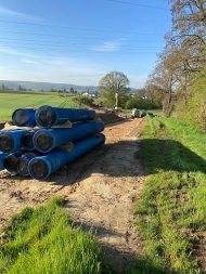 Im Auftrag der Stadtwerke Solms wurde in Oberbiel in der Verlängerung der Norrstraße in Richtung des Hochbehälters eine neue Fallleitung auf einer Länge von ca. 900m verlegt. Die vorhandene in die Jahre gekommene Fallleitung musste hier komplett erneuert werden. Die Baumaßnahme wurde in 2 Bauabschnitten erledigt.