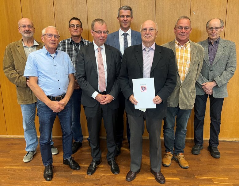 Im Beisein seiner Ortsgerichtskollegen, dem Ortsgerichtsvorsteher des Ortsgerichtes Solms III Niederbiel/Oberbiel Jörg Leidecker, des stellvertretenden Ortsgerichtsvorstehers Martin Keil sowie der Ortsgerichtsschöffen Andreas Hofmann, Lars Wilhelm und Willi Gaul hob Bürgermeister Inderthal die Bedeutung von Erwin Müllers ehrenamtlichen Tätigkeiten für das Gemeinwesen noch einmal hervor.