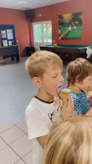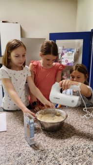 Zu Beginn erzählten die beiden von ihrem Vorhaben Eiswaffeln mal ganz anders zu befüllen als es üblich ist. „Tatsächlich haben wir das auch noch nie gemacht und wir schauen gemeinsam was am Ende dabei herauskommt“, lacht Gash. Also begann das Experiment und es wurde zunächst in zwei Gruppen Rührteig zum befüllen hergestellt. Einige Schokoraspeln dürfen da natürlich nicht fehlen. Die dritte Gruppe hatte dann die Aufgabe die fertigen Eiswaffeln vorsichtig mit dem Teig zu befüllen. Dabei musste darauf geachtet werden, dass sie nicht zu voll befüllt werden und die Waffel nicht schon aufplatzt. „Und wie wird das jetzt gebacken?“, fragt sich ein Teilnehmer. „Wir haben hier Kastenformen zum Backen, die wir mit Alufolie umwickelt haben. Hier können wir die Eiswaffeln jetzt reinstellen ohne das sie umfallen.“, erklärt Eckert. Und so wurden die Formen mit den Eiswaffeln in den Ofen gestellt und der Kuchen konnte hochbacken. Nachdem sie etwas abgekühlt waren, konnten die Kinder und Jugendlichen ihre Kuchen in der Eiswaffel noch mit Zuckerguss und Streuseln verzieren. Es dauerte nicht lange, bis die Eiswaffel gegessen wurden. „Die sind ja richtig lecker“, stellt eine Teilnehmerin fest. Es sind so viele kleine Kuchen in Eiswaffeln geworden, dass sich sogar alle noch etwas mit nach Hause nehmen konnte und somit eine schöne Erinnerung an das Ferienprogramm haben, bevor die Schule wieder anfängt.