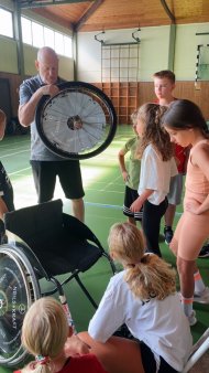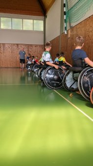 20 Kinder tauchten gemeinsam mit Michael Krayl vom RSV Lahn-Dill in die Welt des Rollstuhlbasketballs ein.