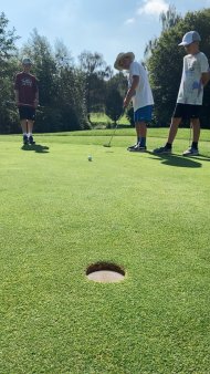 Unter Anleitung des Jugendwarts Thorsten Gieß und der Trainerin Silke wurden die Kinder in die Welt des Golfs eingeführt. Zunächst gab es eine kurze Einführung, bei der die verschiedenen Schläger, welche beim Golf verwendet werden, vorgestellt wurden. Ausgestattet mit diesen ging es zunächst zum Putten aufs Grün. Das ähnelt dem Minigolf, was viele der Teilnehmenden schon mal gespielt haben. Hier wurde geübt, den Golfball in die Löcher zu befördern. Ein Spiel in Kleingruppen ermöglichte den Kindern gegeneinander anzutreten und zu üben so wenig Schläge wie möglich zu brauchen. Dabei wurde ihnen die richtige Haltung des Schlägers erklärt. Danach wurde der Chip trainiert, bei dem der Golfball aus dem hohen Gras ins Grün befördert werden soll. Abschließend ging es noch zur Driving Range, wo die Kinder ihre ersten Abschläge üben konnten. Mit viel Begeisterung schwingten sie die Schläger und versuchten, den Ball soweit wie möglich zu schlagen. Die Trainer gaben dabei hilfreiche Tipps und die ersten Erfolge konnten gefeiert werden. Zum Abschluss grillte das KiYou-Duo Gash und Eckert noch für die Kinder und Eltern, die zum Abschluss auf den Golfplatz eingeladen wurden. Die Kinder gingen mit strahlenden Gesichtern und vielen neuen Eindrücken nach Hause. Und vielleicht gibt es sogar den Wunsch, das Golfspielen weiter zu verfolgen!