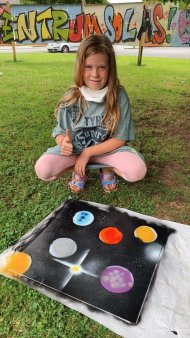 Nach der Einführung ging es dann endlich los. Zuerst durften sich alle erstmal an einer großen Holzwand ausprobieren. Es fing mit einfachen Strichen an und auch Buchstaben durften ausprobiert werden. Als die Kinder und Jugendlichen den Dreh raushatten, durften sie ihr ganz eigenes Bild erstellen. Dafür bekamen alle eine grundierte Holzleinwand. Durch verschiedene Techniken war es ihnen möglich ganze Galaxien zu erstellen.
