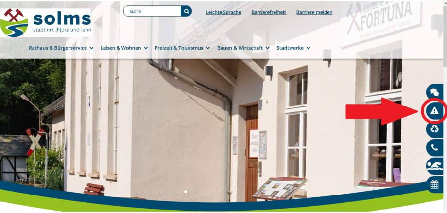 Seit kurzem hat die Stadt Solms einen Mängelmelder auf der Homepage der Stadt. Zu finden ist er im Quicklink Menü ganz rechts auf der Seite der Homepage der Stadt. Der Mängelmelder verbirgt sich hinter dem blauen Quicklink mit dem Ausrufzeichen.