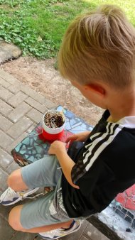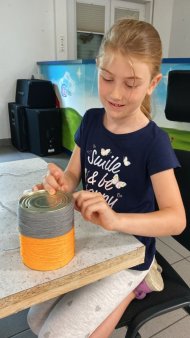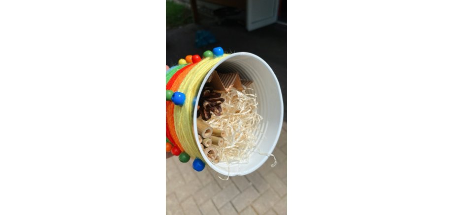 Gemeinsam mit Felix Drebes von der Kinder- und Jugendförderung der Stadt Solms, sowie den beiden Stadtjugendpflegerinnen Julia Gash und Nadine Eckert, machten sich alle gemeinsam ans Werk. Die Konservendosen wurden zunächst mit verschiedenen Wollen umwickelt. Dabei waren der Kreativität de Kinder keine Grenzen gesetzt. Aus den Konservendosen wurden kleine Bienchen, Elefanten oder einfach bunte Hingucker für den Garten. Natürlich durften bei den Tieren keine Augen fehlen und eine Schnur zum aufhängen brauchten die Dosen auch. Als die Kinder mit dem Gestalten der Dosen fertig waren, befüllten sie diese noch mit Materialien, in denen sich die kleinen Erdenbewohner besonders sicher fühlen. In Tannenzapfen, Holzwolle, Bambusstäben und Wellpappe können die Insekten in aller Ruhe und gut geschützt vor ihren Feinden nisten. So konnten alle Kinder ihre ganz eigenen Kreationen mit nach Hause nehmen und den Insekten in ihrer Umgebung ein Zuhause geben.