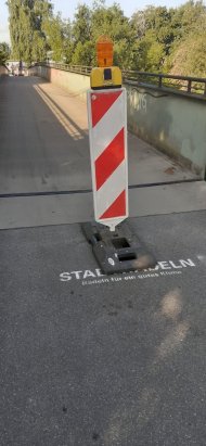 Da die Überfahrt der Brücke mit PKW weiterhin unzulässig ist, werden dort jetzt an den beiden Einfahrten zur Brücke feste Betonblocksteine aufgestellt, die die Überquerung der Brücke nur noch für Radfahrer und Fußgänger ermöglichen sollen.