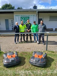 Der neue Mähroboter auf dem Rasenplatz in Solms-Oberbiel ist bereits im Einsatz und ersetzt den bisherigen Aufsitzmäher weitestgehend. Sein elektrischer Betrieb senkt die jährlichen CO₂-Emissionen um rund 83 Prozent, sodass der Platz künftig fast klimaneutral gemäht wird. Weil der Roboter das Gras in kurzen Intervallen fein schneidet und als Mulch liegenlässt, gelangen wertvolle Nährstoffe sofort wieder in den Boden; dadurch können wir ein bis zwei Düngegänge pro Jahr einsparen. Dank seines geringen Gewichts verdichtet das Gerät den Boden nicht und kann selbst bei feuchter Witterung fahren, ohne Spurrillen zu hinterlassen. Lärm und Abgase gehören ebenfalls der Vergangenheit an – ein Gewinn für Spieler, Anwohner und Umwelt. Zudem entfällt das aufwändige Abtransportieren von Grünschnitt, was Zeit, Treibstoff und Personalressourcen spart. Die Investition amortisiert sich somit in wenigen Jahren, während der Rasen dauerhaft in bestmöglichem Zustand bleibt und der Platz nahezu jederzeit bespielbar ist. Die wöchentliche Wartung, sowie Reinigungsarbeiten der Mähroboter übernimmt der Verein SG 08 Oberbiel.