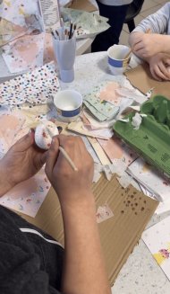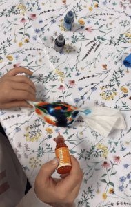 Den krönenden Abschluss bildete das Gestalten von Ostereiern und Eierhaltern. An insgesamt vier Stationen konnten sich die Kinder kreativ austoben: Eierhalter wurden mit Acrylfarben bemalt, während die Eier selbst auf unterschiedliche Weise gestaltet wurden: mit Milch und Serviettentechnik, mit Essig und Lebensmittelfarbe oder ganz klassisch mit bunten Stiften. Am Ende nahm jedes Kind stolz ein kleines Osternest mit sechs individuell gestalteten Eiern mit nach Hause.