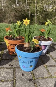 Beim zweiten Programmpunkt „Frühling zum Mitnehmen“ wurde es kreativ und farbenfroh. Die Kinder gestalteten ihre eigenen Blumentöpfe und bepflanzten diese anschließend mit frischen Frühlingsblumen, darunter auch leuchtend gelbe Osterglocken. So konnten alle ein kleines Stück Frühling mit nach Hause nehmen.