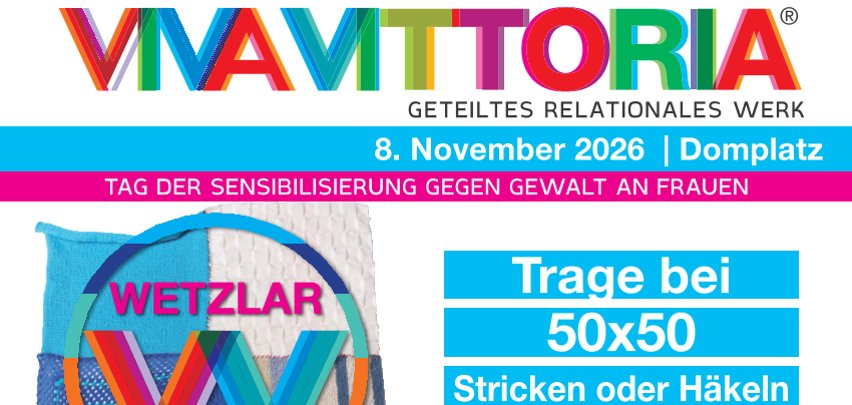 Unter dieser Prämisse hat Regina Gehring, Geschäftsführerin des Vereins Frauenhaus Wetzlar e. V.“, zusammen mit einem Team von engagierten Helferinnen und Helfern das Projekt „Viva Vittoria“ nach Wetzlar geholt. Im Rahmen dieses Mitmachprojektes sind alle Handarbeit-Fans – Frauen und Männer - aus Wetzlar, aus der Region, aus Nah und Fern aufgerufen, bunte Wollquadrate (50 x 50 cm) nach eigenem Gusto zu stricken oder zu häkeln. Am 8. November diesen Jahres soll jedes Stück Teil einer farbenprächtigen Installation auf dem Domplatz aus Hunderten von bunten Wolldecken werden, die den gesamten Platz bedecken, die Sinne erfreuen und für ein Zusammenleben ohne Gewalt sensibilisieren.