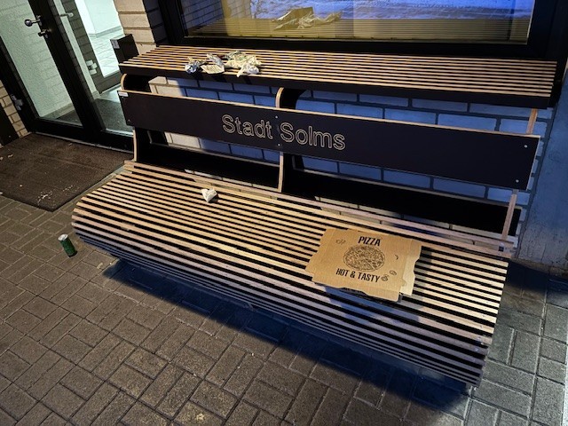 besonders an den Wochenenden in der dunklen Jahreszeit laden die beleuchteten Sitzbänke am Rathaus vor allem jüngere Menschen zum Verweilen ein. Umso wichtiger ist es, dass Eingangsbereich und Umfeld sauber und einladend bleiben – leider war das zuletzt nicht immer der Fall (siehe Fotos).