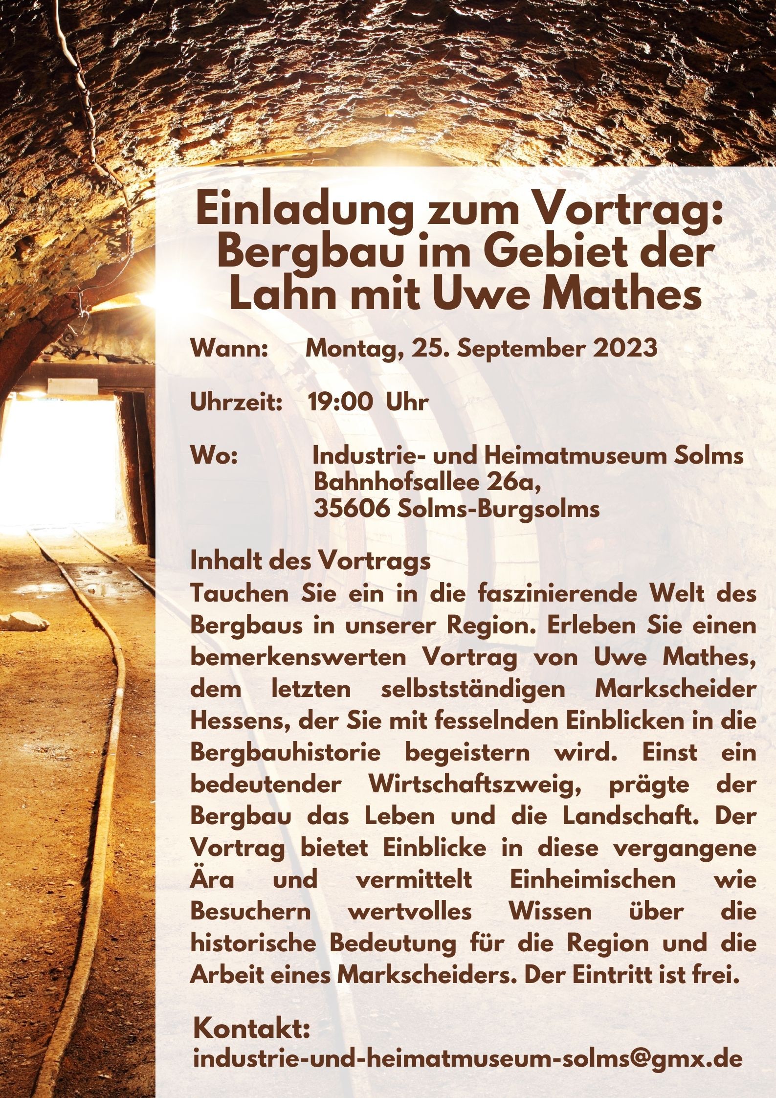 Tauchen Sie ein in die faszinierende Welt des Bergbaus in unserer Region. Erleben Sie einen bemerkenswerten Vortrag von Uwe Mathes, dem letzten selbstständigen Markscheider Hessens, der Sie mit fesselnden Einblicken in die Bergbauhistorie begeistern wird. Datum: Montag, 25. September 2023 Uhrzeit: 19:00 Uhr Veranstaltungsort: Industrie- und Heimatmuseum Solms, Bahnhofsallee 26a, 35606 Solms Einst ein bedeutender Wirtschaftszweig, prägte der Bergbau das Leben und die Landschaft. Der Vortrag bietet Einblicke in diese vergangene Ära und vermittelt Einheimischen wie Besuchern wertvolles Wissen über die historische Bedeutung für die Region. Entdecken Sie die Bedeutung des Begriffs "Markscheider" und erfahren Sie, wie diese Fachleute eine entscheidende Rolle im Bergbau spielten, indem sie die Vermessung und Planung von Bergwerken übernahmen und auch heute noch übernehmen. Der Eintritt zu dieser spannenden Veranstaltung ist frei. Nutzen Sie diese Gelegenheit, um Ihr Wissen über die Bergbaukultur im Lahngebiet zu erweitern und einen Blick in die Vergangenheit zu werfen. Wir freuen uns auf Ihr Kommen!