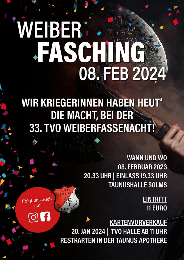 Unter dem Motto "Wir Kriegerinnen haben heut' die Macht, bei der 33. TVO Weiberfassenacht!" laden wir alle feierfreudigen Frauen aus Nah und Fern zur Oberndorfer Weiberfastnacht ein.