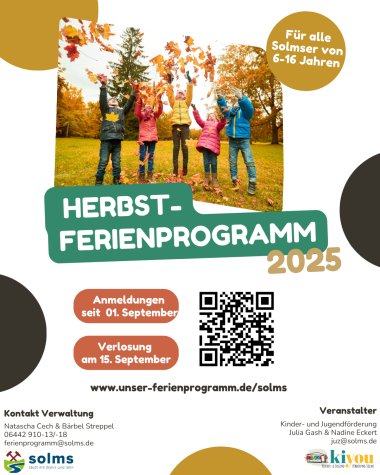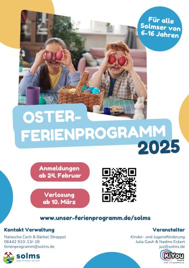 Wir sind jedes Jahr bemüht ein abwechslungsreiches und interessantes Ferienprogramm anzubieten. In Zusammenarbeit mit der Kinder- und Jugendförderung der Stadt Solms und den ortsansässigen Vereinen entsteht ein spannendes und vielseitiges Programm welches für unterschiedlichste Interessen Veranstaltungen bietet.