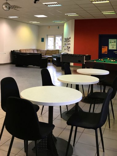 Das Jugendzentrum selbst besteht aus einem großen Raum, der durch eine Theke mit der Küche verbunden ist, sowie einem Funktionsraum und zwei Toilettenanlagen.