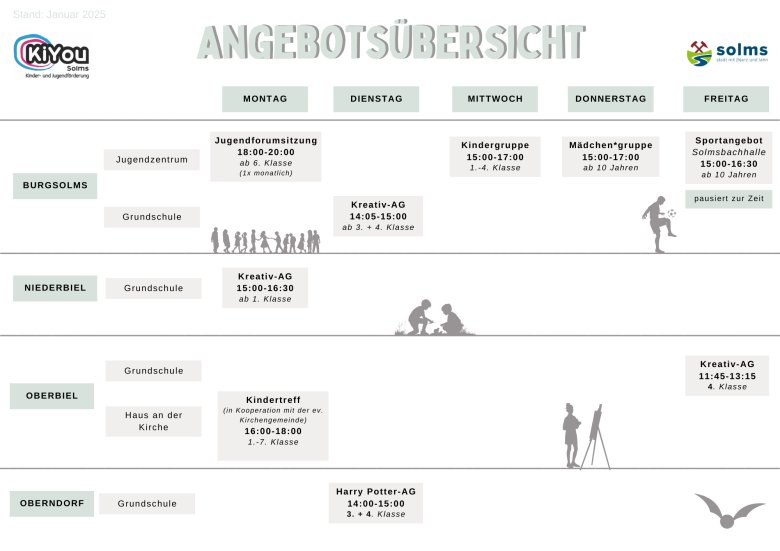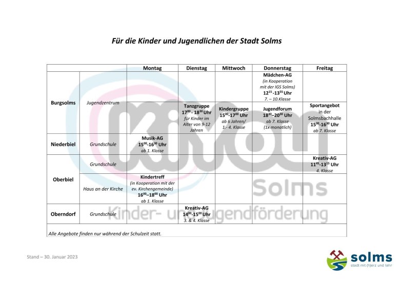 Die Kinder- und Jugendförderung der Stadt Solms bietet eine Vielzahl von Freizeitangeboten an. Dazu zählen wöchentliche Angebote im Jugendzentrum, der Solmsbachhalle und an diversen Solmser (Grund-)Schulen. Die Angebote finden ausschließlich in der Schulzeit statt.