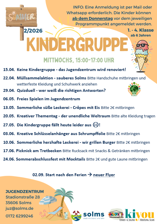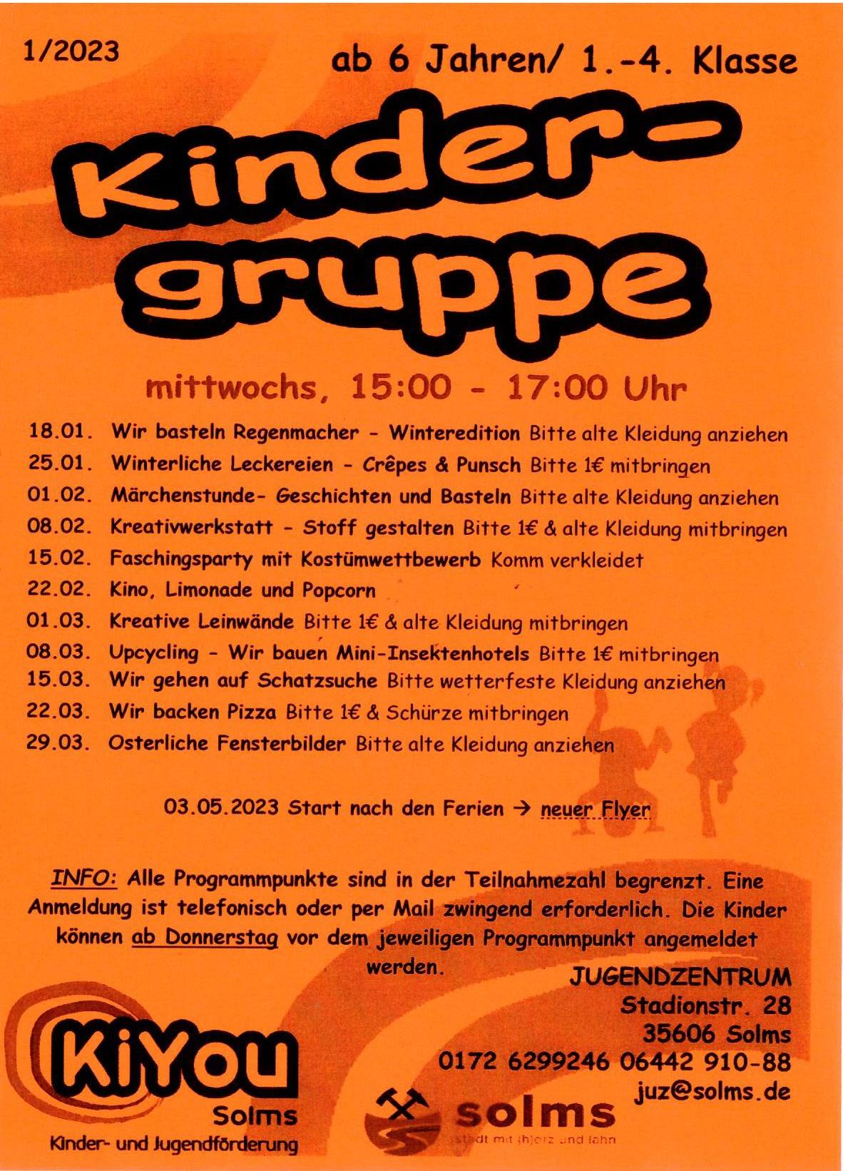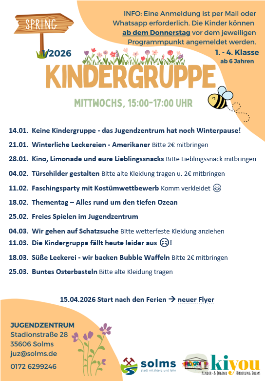 Jeden Mittwoch von 15:00 – 17:00 Uhr findet im Jugendzentrum Burgsolms die Kindergruppe für Kinder von der ersten bis zur vierten Klasse statt.
