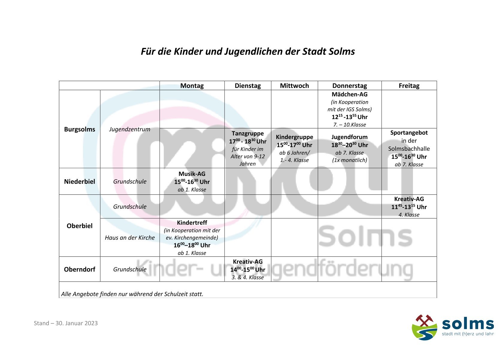 Jeden Freitag von 15:00 – 16:30 Uhr findet ein Sportangebot in der Solmsbachhalle von der Kinder- und Jugendförderung der Stadt Solms statt. Hier können alle Sportbegeisterten ab der siebten Klasse teilnehmen und einfach vorbeikommen. Dabei könnt ihr jede Woche selbst entscheiden, was ihr gerne machen möchtet. Von Basketball über Fußball oder Jugger ist alles möglich.