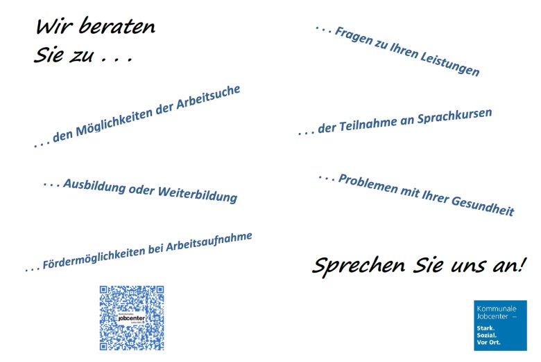 Ohne Termin – kommen Sie vorbei und lassen Sie sich unkompliziert beraten. Vor Ort stehen Ihnen Mitarbeitende des Jobcenters Lahn-Dill aus dem Vermittlungs- und Leistungsbereich für Ihre Fragen und Anliegen zur Verfügung.